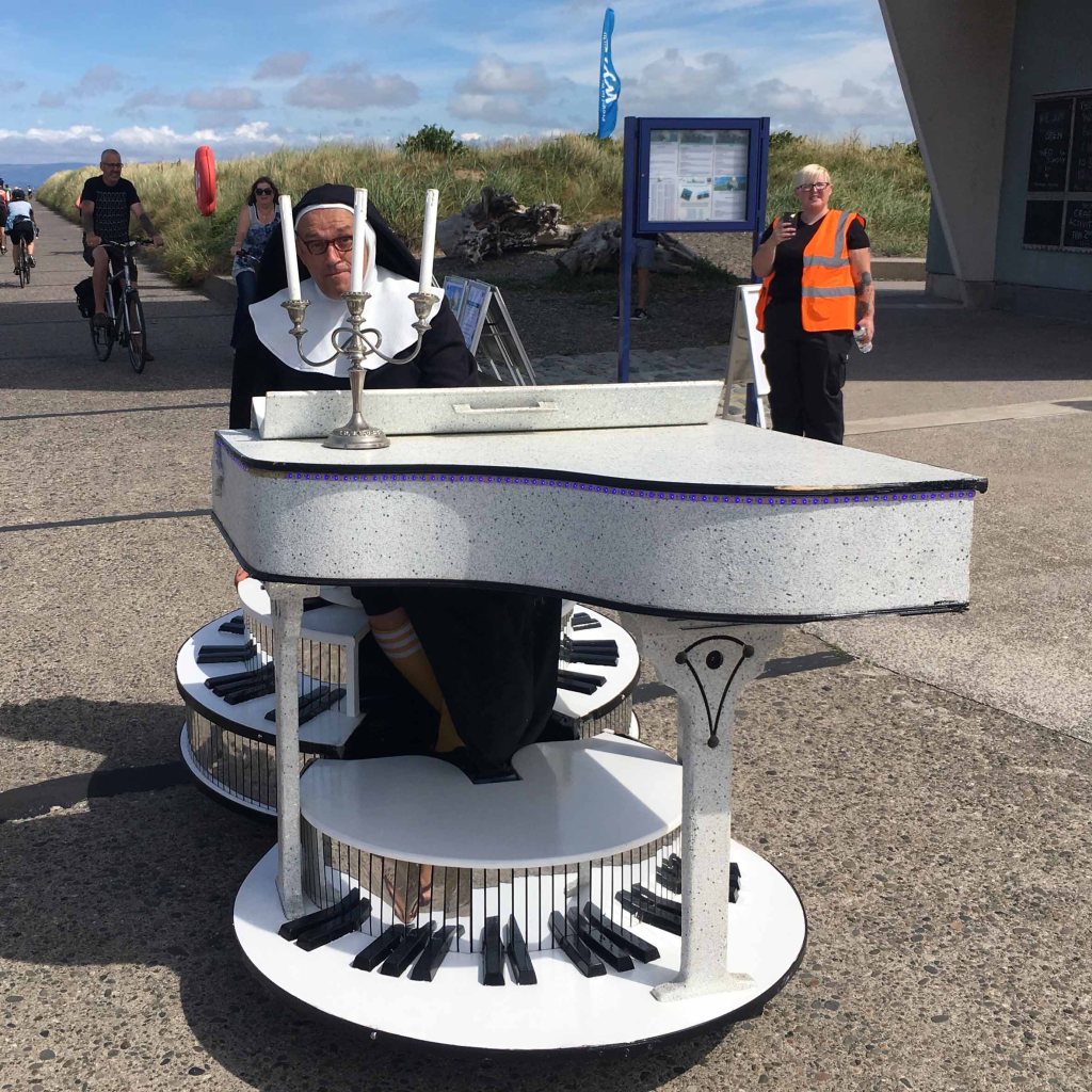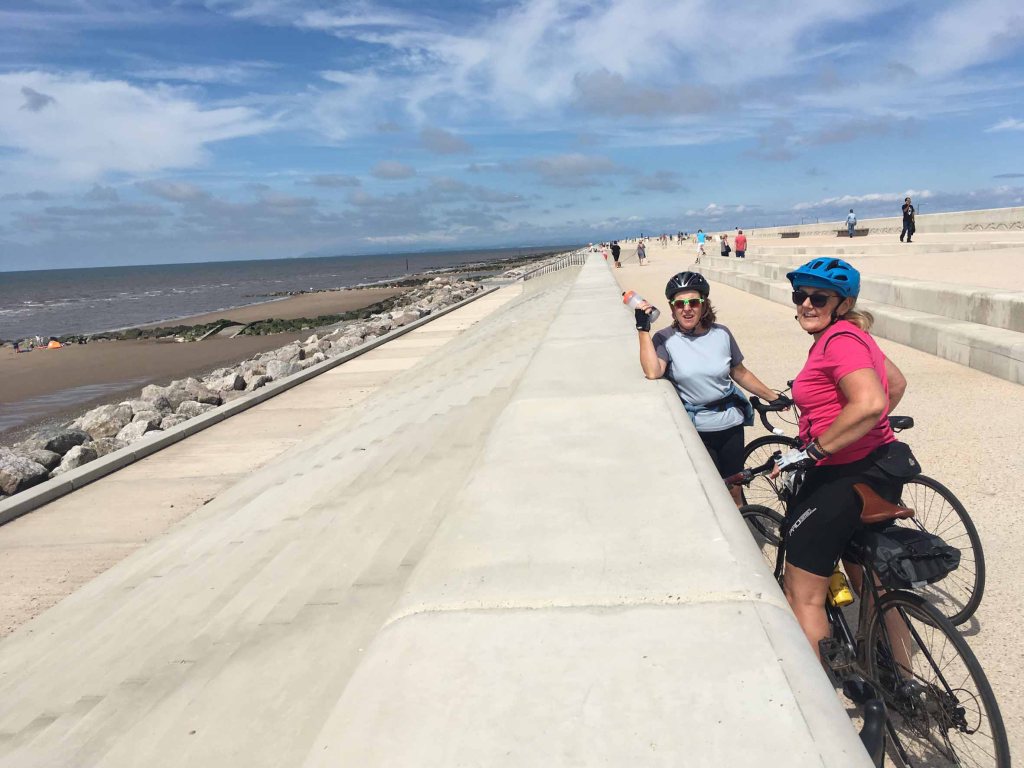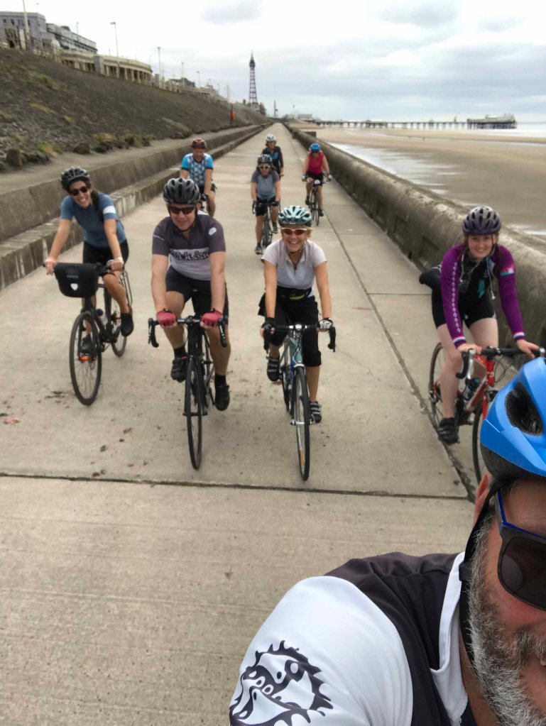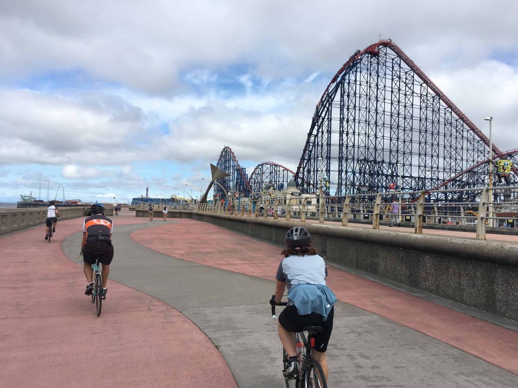 Much swerving of buggies, day-trippers, mobility scooters, hen and stag doo’s occurred along Blackpool promenade, before things quietened down along the sea wall past Cleavleys. Stunning views across Morecambe Bay whilst being serenaded by a cross dressing nun on a motorised piano.