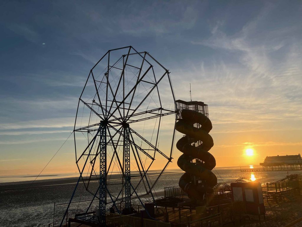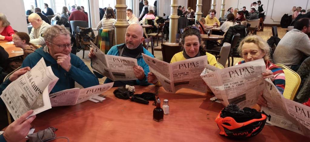 We followed the south bank on a concrete flood defence along to Immingham, ships, docks, piers and industry silhouetted against a cold blue day. To get the other side of the transporter terminal we had to sound an alarm which resulted in a security guard walking us across the forecourt and onwards towards the three crumbling lighthouses. A photo of the 100th taken we headed away from the coast to clear the chemical works rejoining at Grimsby and through to Cleethorpes for fish and chips on the pier.