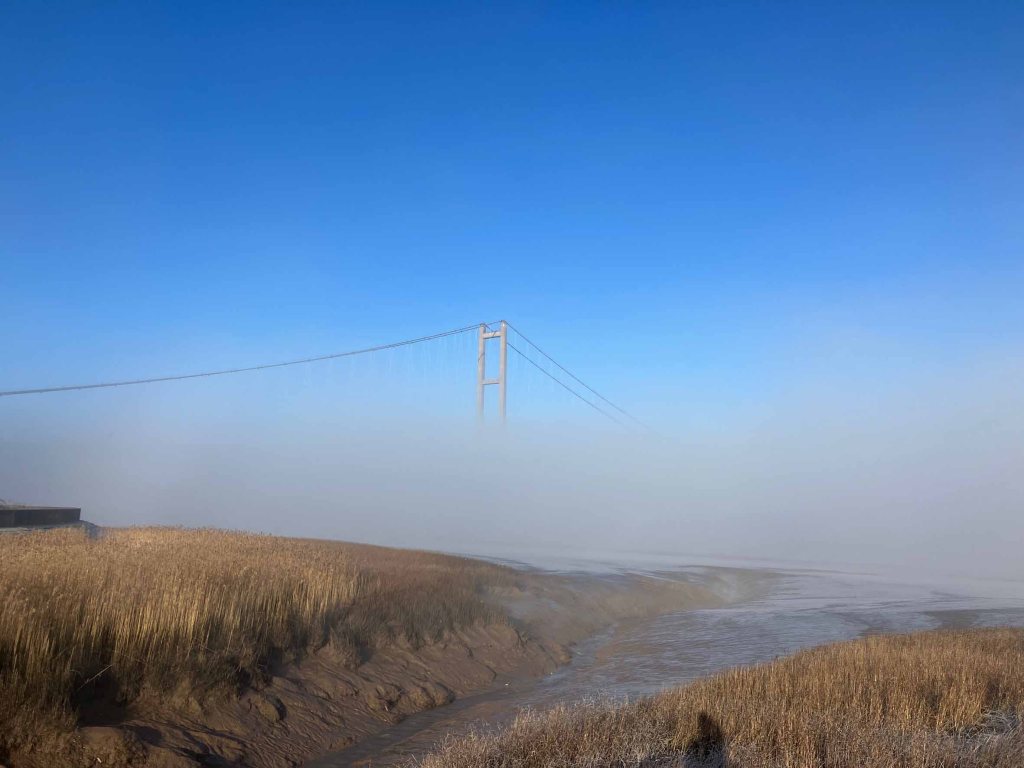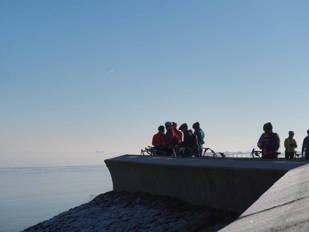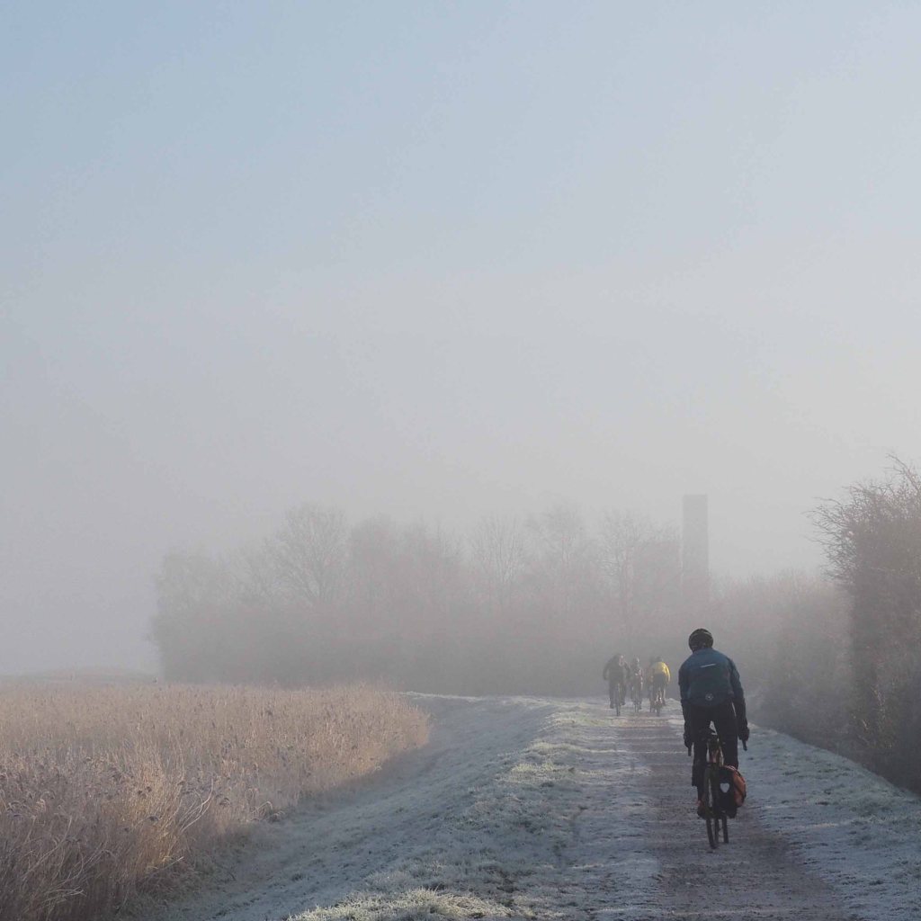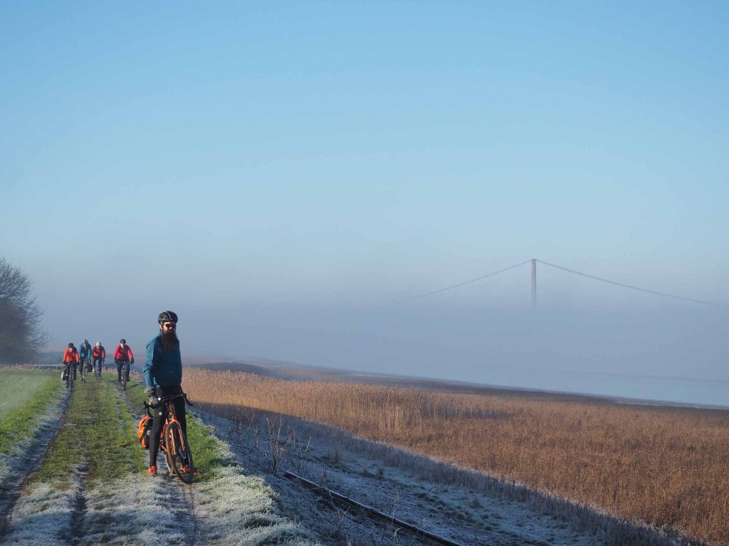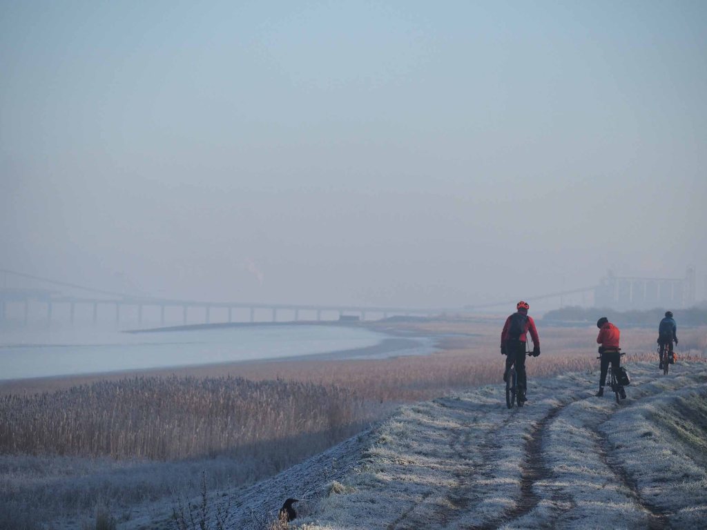 With 97 lighthouses visited the South Humber ride would get us to 100! It wasn’t looking like the most interesting trip but being a milestone we had plenty of interest! Jane and I got up early headed through freezing fog to Cleethorpes. Dumping the car on the seafront we boarded the train to Barton on Humber to meet the rest riders as well as Sams frozen beard. The first section was on the waterfront pedalling on frozen ground with the bridge and old river infrastructure appearing from the mist. We elected for a bit of smooth tarmac before rejoining the humber further down. Approaching the river via little rise to then see the whole waterfront of Hull and beyond open up before us. The water was still, the air sharp, the view breathtaking. This ride was going way better than we expected!!!!