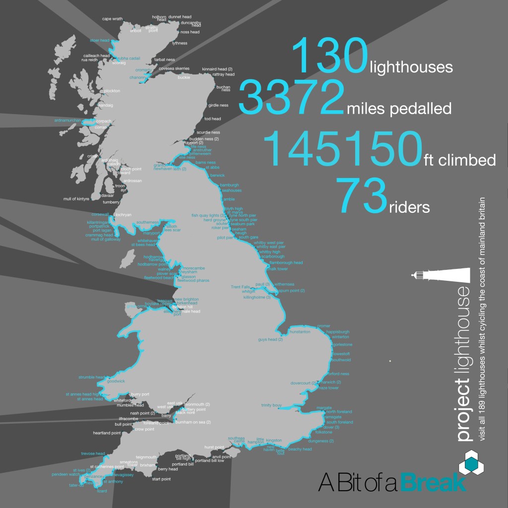 All mainland lighthouses are shown. The name of the lighthouse changes to blue once it has been visited. The current pedalled journey is also tracked by where the lighter grey hits the coast.